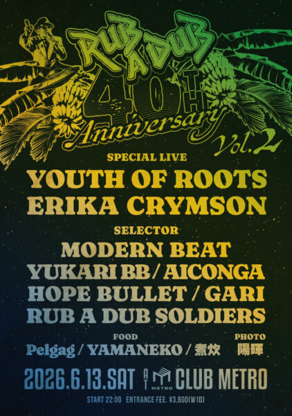 1986年2月のオープン以来、老舗レゲエバーとして日本全国にその名を轟かすレゲエの聖地、三条木屋町の「RUB A DUB」が遂に祝40周年!!! 先日開催の第一弾もラバダブ愛に溢れとてつもなく盛り上がりましたが、今宵はそんな伝説的名店の40周年記念大感謝祭パーティー第2弾を開催!! 今回もLIVEにセレクターにとラバダブゆかりの豪華ラインナップが今回も大集結です!OPEN:22:00